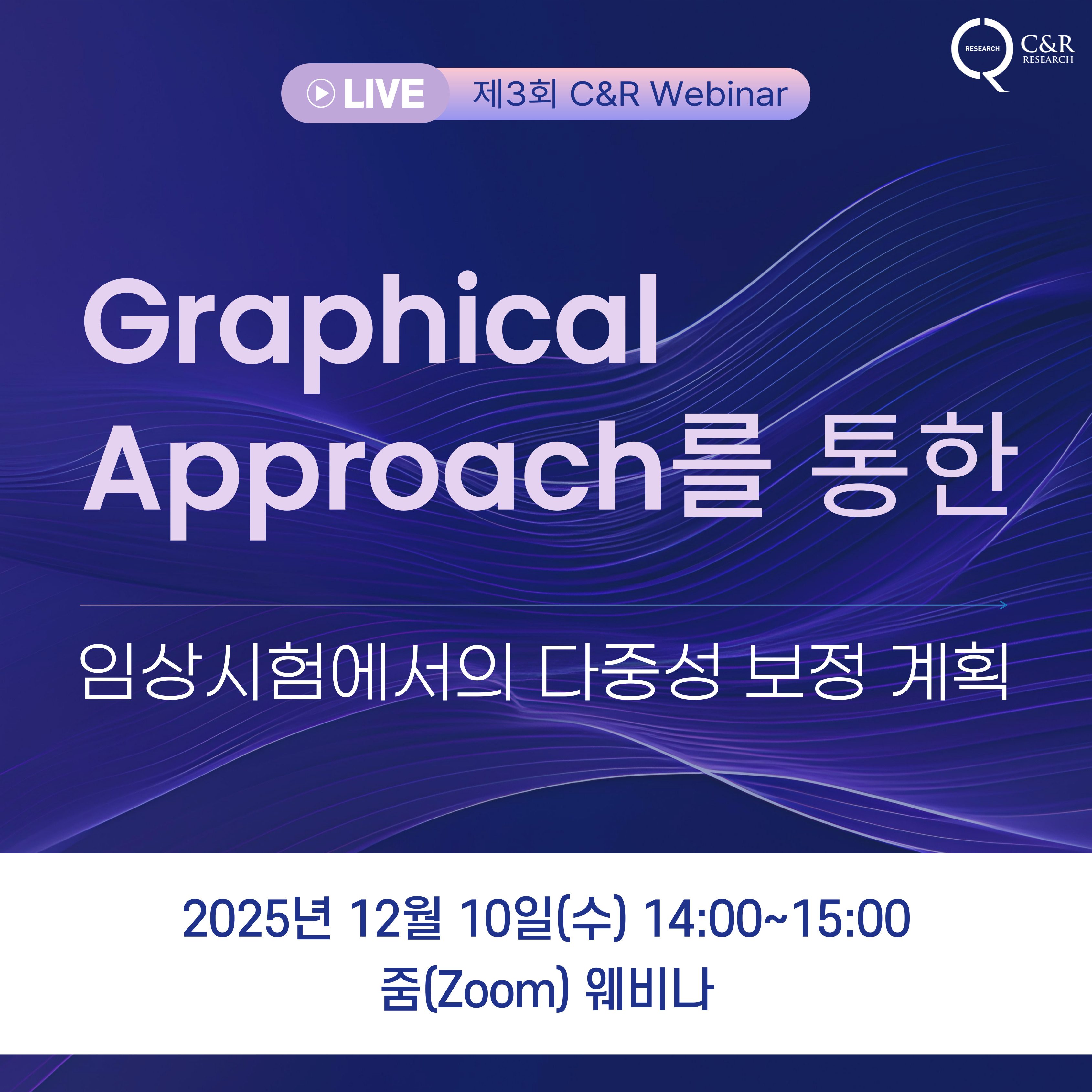 ⭐ 웨비나 사전 등록 바로가기 (클릭) ⭐ * 다가오는 12월 10일, 씨엔알리서치의 세번째 웨비나에 여러분을 초대합니다! ‘Graphical Approach를 통한 임상시험에서의 다중성 보정 계획’ 주제로 Graphical Approach의 개념과 실무 적용 사례를 함께 살펴보는 뜻깊은 자리를 마련했습니다. 씨엔알리서치 BS Advisor 정지원 통계학 박사님과 함께Graphical Approach에 대한 이해를 한층 더 넓히는 기회가 되시기를 바랍니다. * [웨비나 안내]✔ 세부 주제: 직관과 전략의 만남 - Graphical Approach의 이해와 적용✔ 연사: 씨엔알리서치 BS Advisor 정지원 통계학 박사