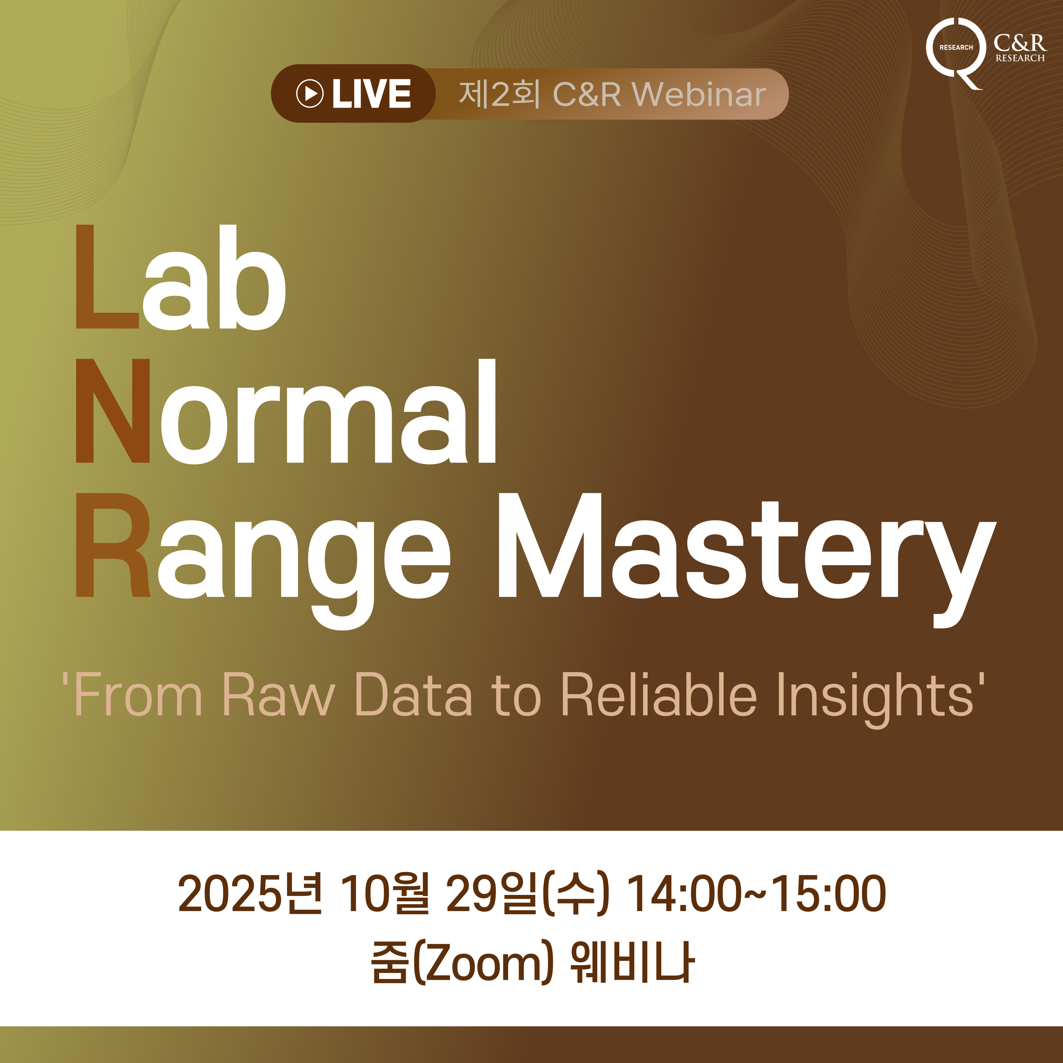 ⭐ 웨비나 사전 등록 바로가기 (클릭) ⭐ * 다가오는 10월 29일, 씨엔알리서치의 두번째 웨비나에 여러분을 초대합니다! ‘LNR(Lab Normal Range) Mastery: From Raw Data to Reliable Insights’ 주제로 올바른 Lab 데이터 수집 및 적용을 위한 통합 가이드를 심도 있게 조명하는 뜻깊은 자리를 마련했습니다. 씨엔알리서치 DM팀의 하헌철 1팀장님, 김진석 3팀장님과 함께LNR의 통합 가이드와 임상 데이터 관리 전략에 대한 이해를 한층 더 넓히는 기회가 되시기를 바랍니다. 웨비나는 두 가지 세션으로 구성되어 진행됩니다. * [세션 1]✔ 주제: Collect it Right: Error Prevention in Lab Normal Range Collection✔ 연사: 씨엔알리서치 Data Management 하헌철 1팀장 [세션 2]✔ 주제: Beyond Collection: Quality Management & Regulatory Alignment✔ 연사: 씨엔알리서치 Data Management 김진석 3팀장